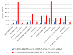 O relatório do ACC apresenta para alguns tipos de produtos uma tabela com dois diferentes cenários: usando os plásticos como fazemos hoje e substituindo os plásticos por materiais compatíveis tecnicamente: vidro, aços, alumínio e papel. As variações dos pesos são dramáticas e podem ser visualizadas no gráfico a seguir.